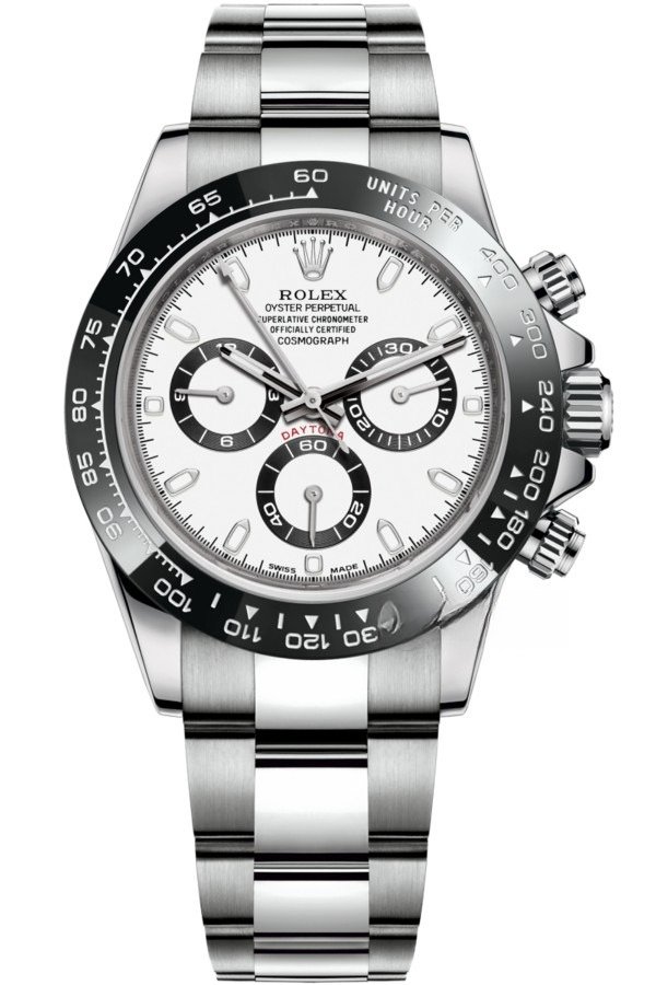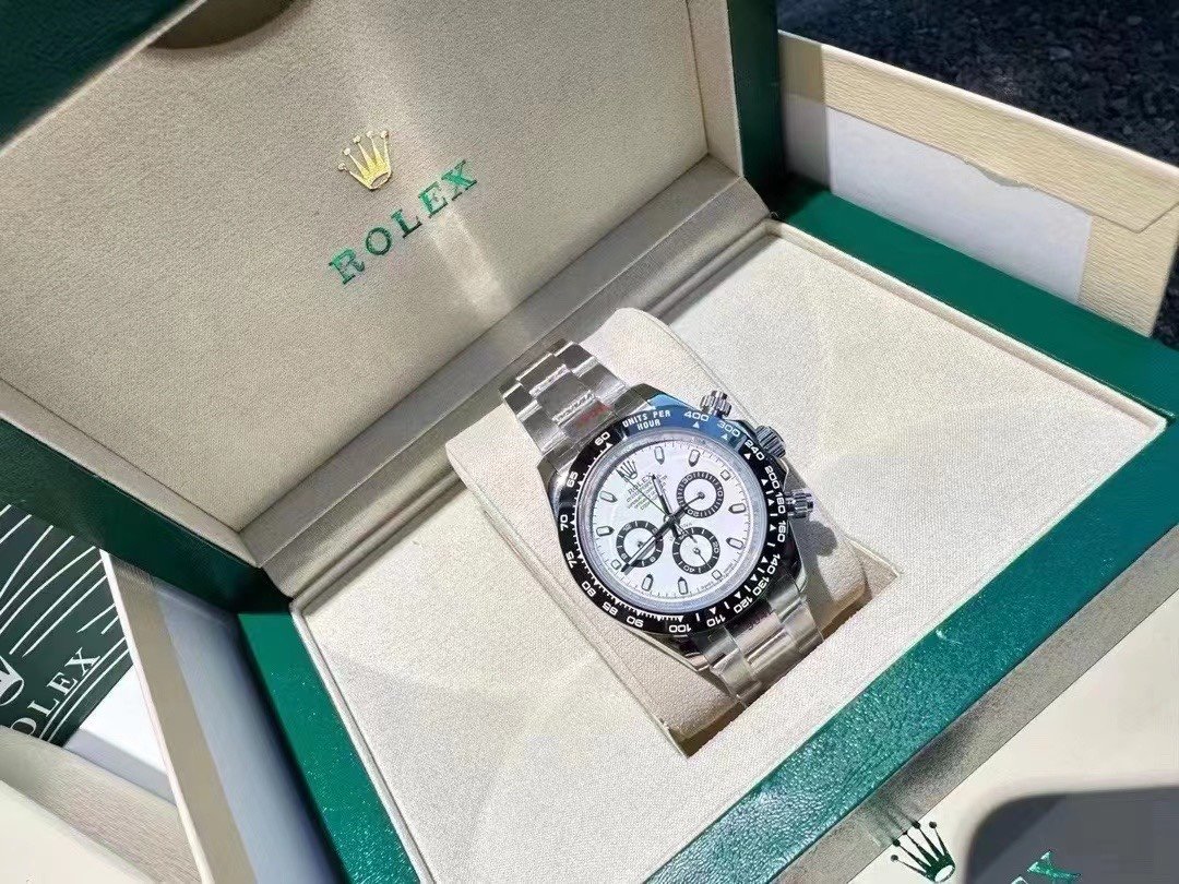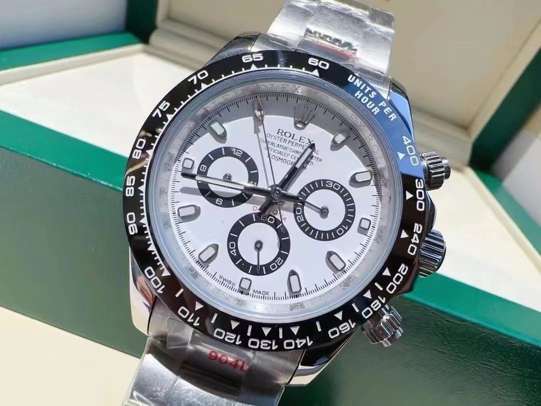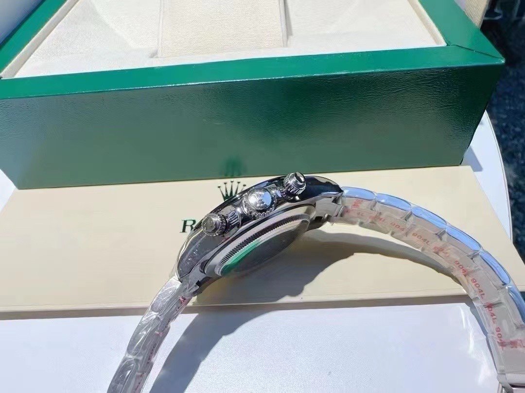 This timepiece features a deep black solid ceramic bezel with a precise tachymeter scale, while the sub-dial text and dial logo are crafted with an overlaid printing technique that creates a subtle raised effect when viewed from the side.