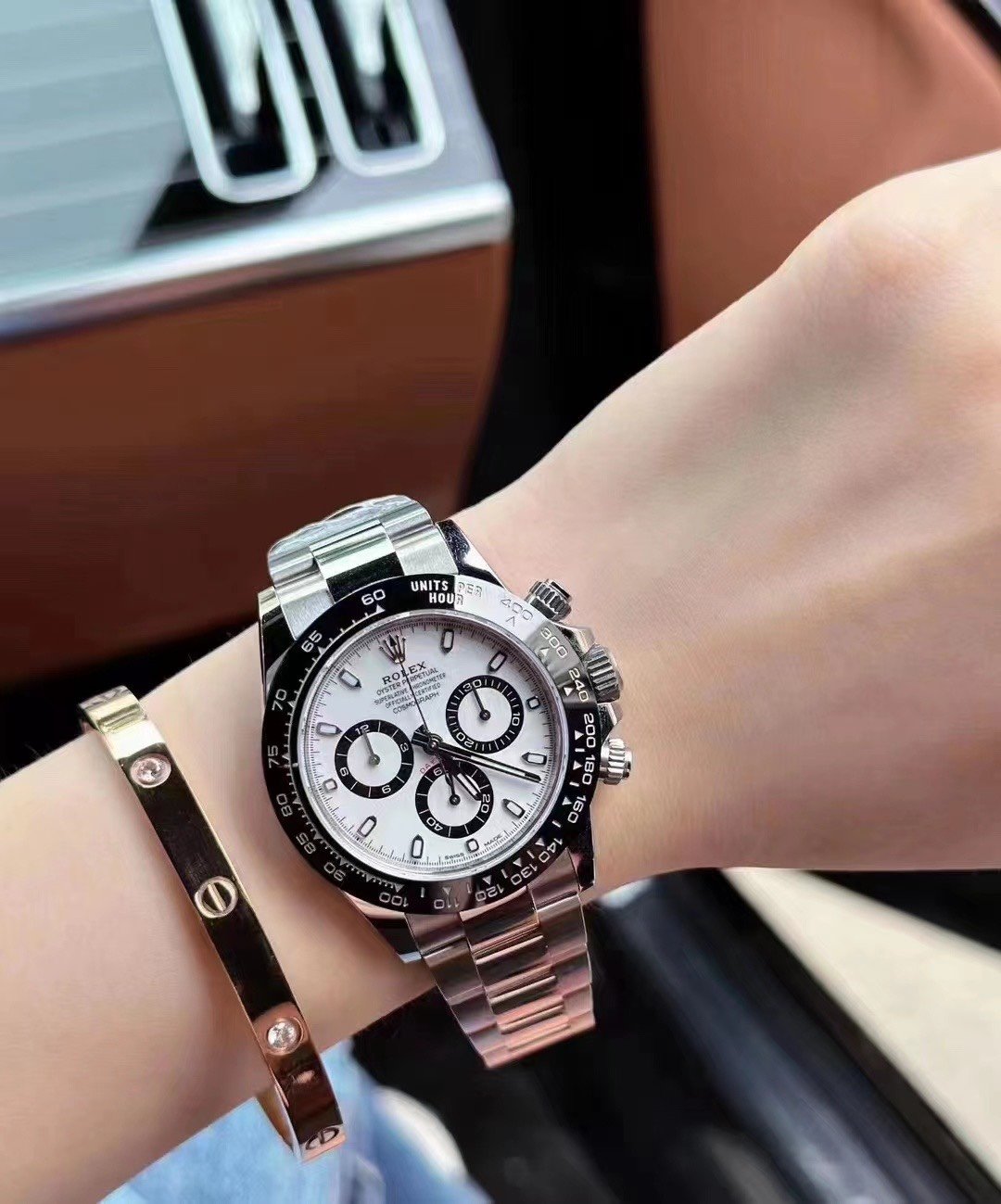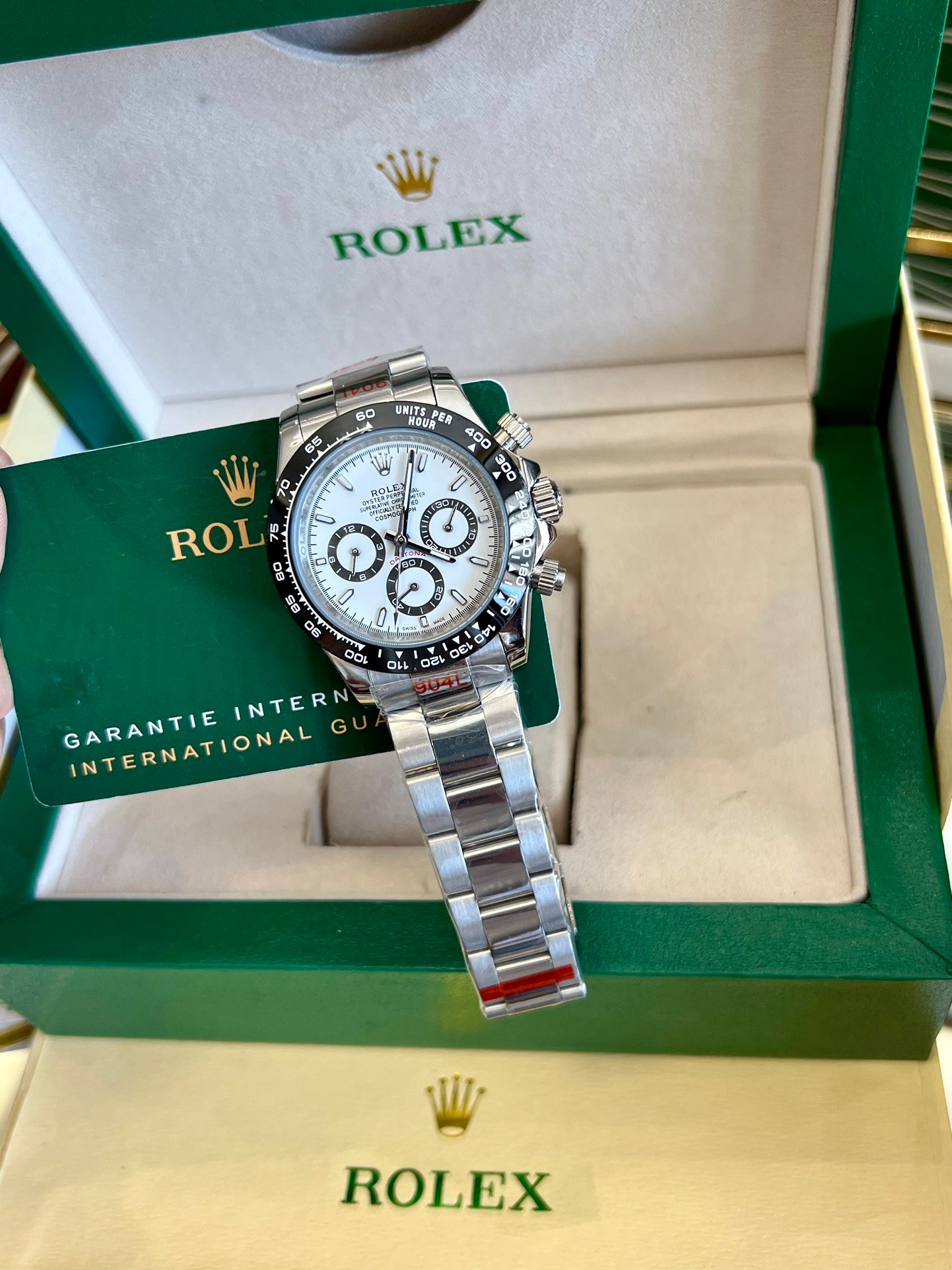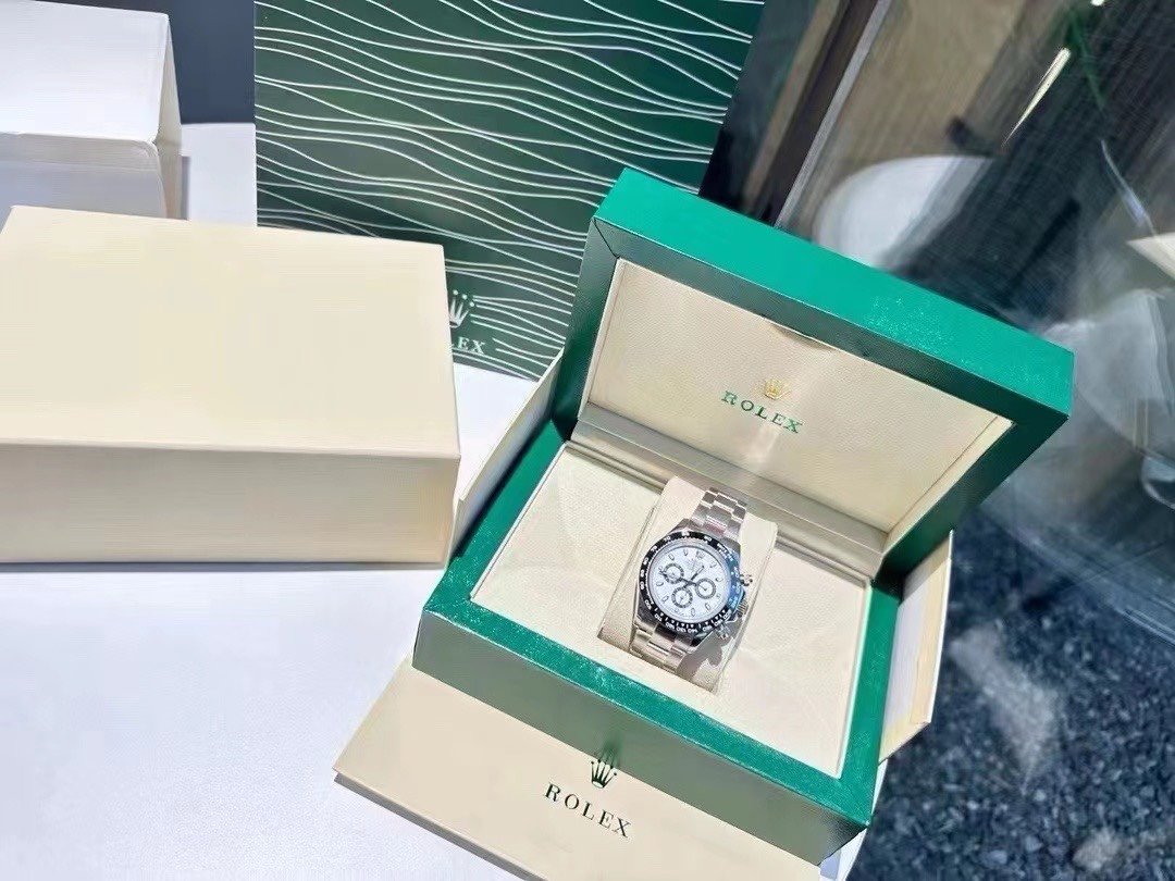 This timepiece features a deep black solid ceramic bezel with a precise tachymeter scale, while the sub-dial text and dial logo are crafted with an overlaid printing technique that creates a subtle raised effect when viewed from the side.