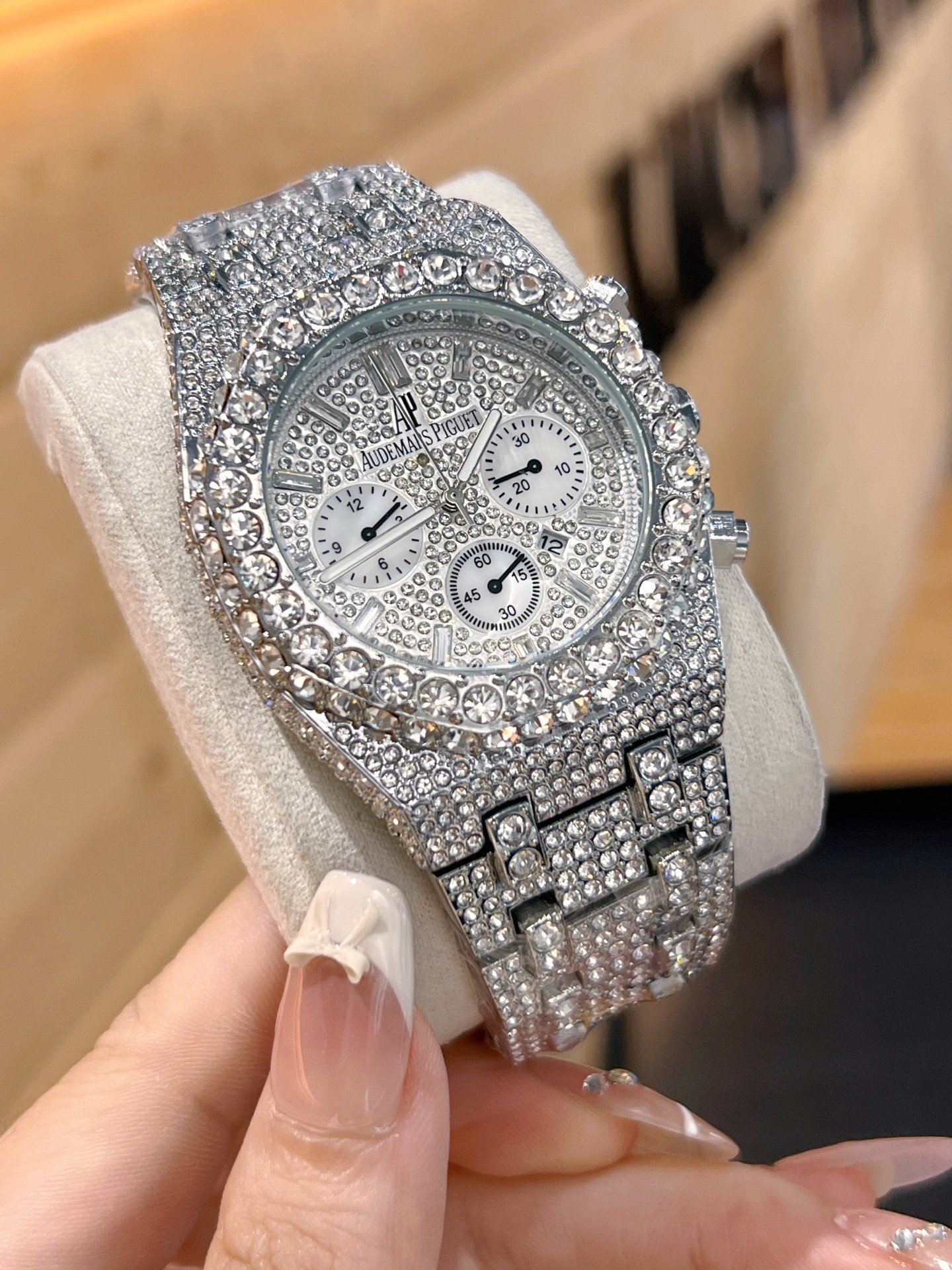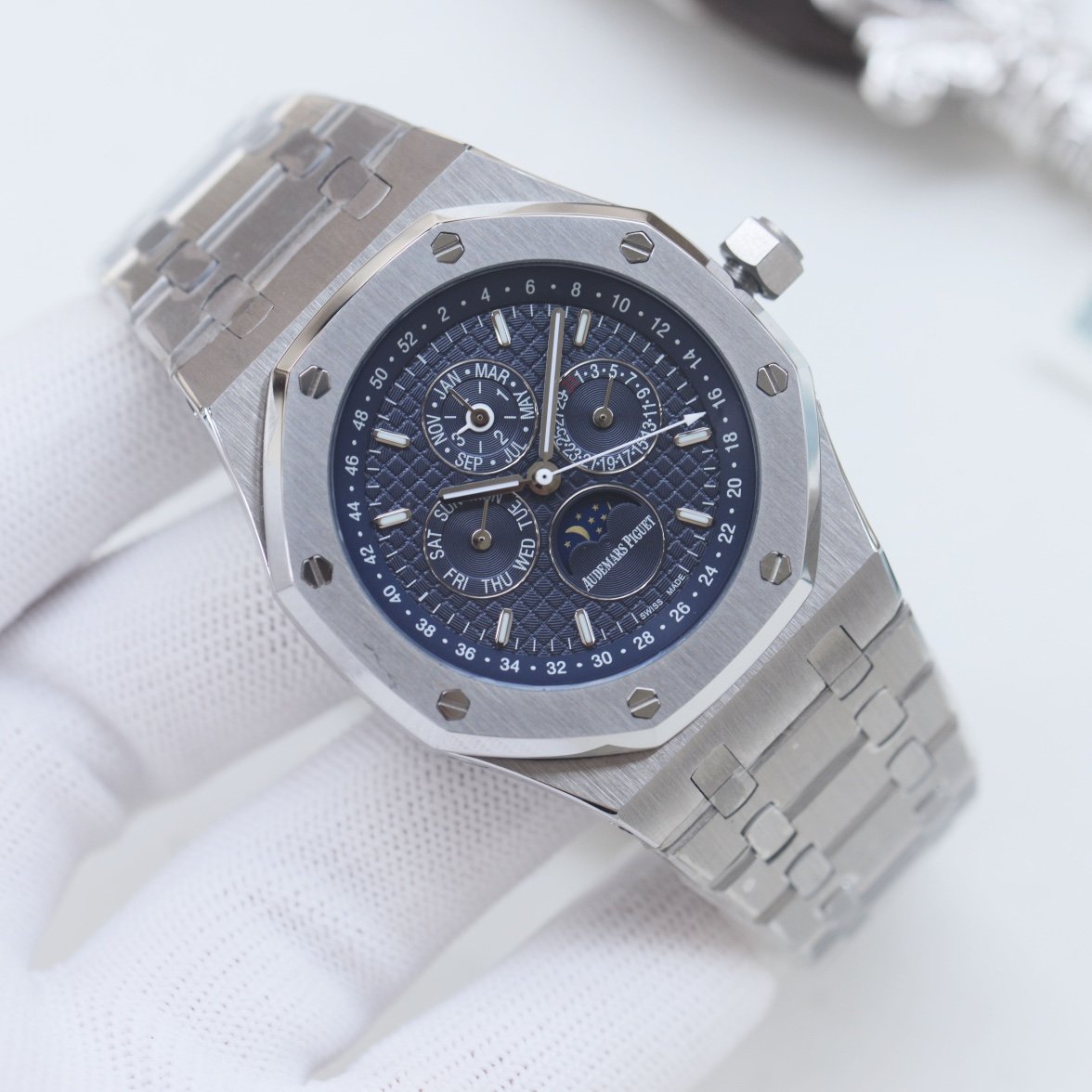 The dial features Audemars Piguet's exclusive "MegaTapisserie" ultra-large checkered pattern decoration, which gives it a strong three-dimensional effect. It has an upgraded ultra-strong luminescent function, and the entire case is processed using CNC technology, perfectly reproducing the original structure. The strap is made of rubber, with a softness that matches the original, highlighting the masculine charm of men